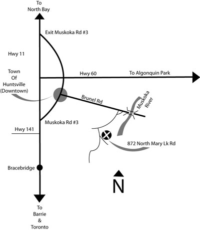 Hwy 11 to Huntsville. Exit Muskoka Rd 3 which is the Main St. Go to the second light, Brunel Rd, turn right. Follow for 2.7 km to North Mary Lake Rd, turn right. Bear to the left at the fork in the road to # 872 or Hwy 60 to Huntsville. Exit Muskoka Rd. #3 which is King William St. Go to the fifth set of lights, Brunel Rd, turn left. Follow for 2.7 km to North Mary Lake Rd., turn right. Bear to the left at the fork in the road to # 872. |